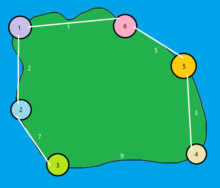 문제:욱제는 KOI를 망친 기념으로 부모님과 함께 코드게이트 섬으로 여행을 떠났다. 코드게이트 섬에는 오징어로 유명한 준오마을(심술쟁이 해커 임준오 아님), 밥으로 유명한 재훈마을, 영중마을 등 많은 관광지들이 있다. 욱제는 부모님을 모시고 코드게이트 섬을 관광하려고 한다.