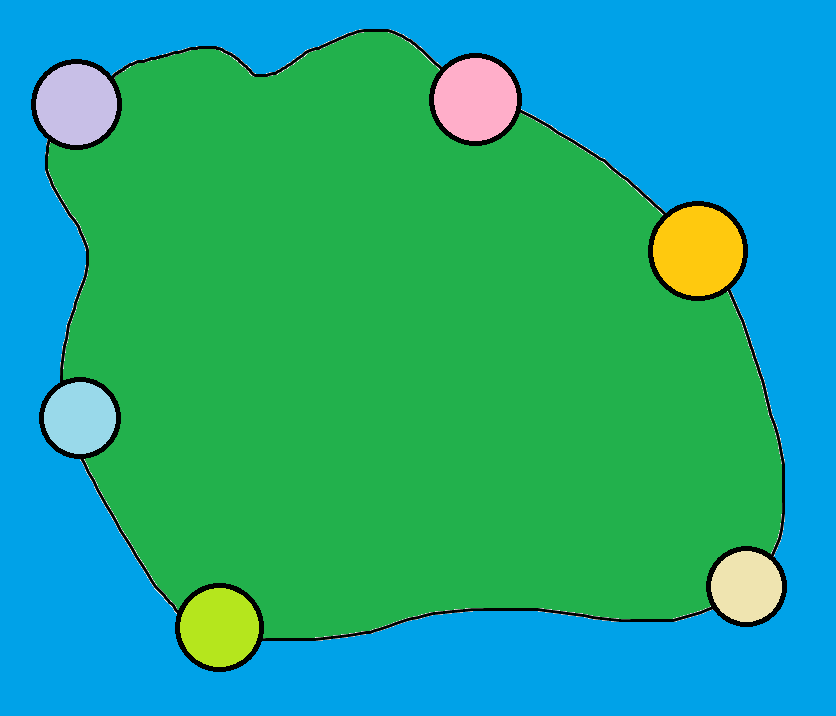 코드게이트 섬은 해안가를 따라 원형으로 마을들이 위치해있다. 임의의 A마을에서 임의의 B마을로 가기 위해서는 왼쪽 또는 오른쪽 도로를 통해 해안가를 따라 섬을 돌아야 한다. 섬을 빙빙 도는 원형의 길 외에 다른 길은 존재하지 않는다.